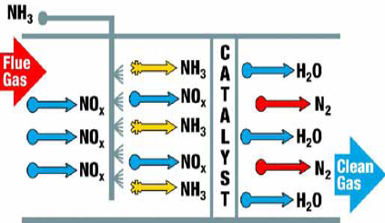 Reduction , SCR)脱硝原理是在一定的温度和催化剂的作用下,还原剂有选择性地把烟气中的NOX还原为无毒无污染的N2和H2O,还原剂可以是碳氢化合物(如甲烷、丙烯等)、氨、尿素等,工业应用的还原剂主要是氨,其次是尿素。